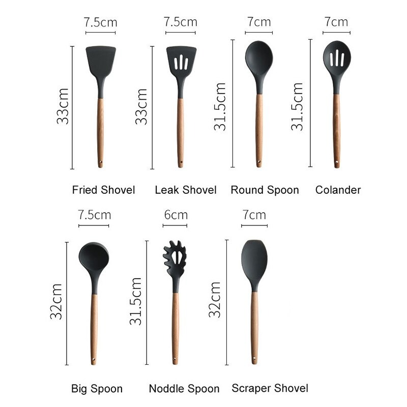 Size: colander: 31.5*7*5cm, powder spoon: 31.5*6.2*5cm, soup spoon: 31*8*5cm, dense spoon: 31.5*7*5cm, leaking shovel: 32.5*8*5cm, tight shovel: 32.5 *8*5, scraper: 32*6*5cm, spatula: 32*7*5