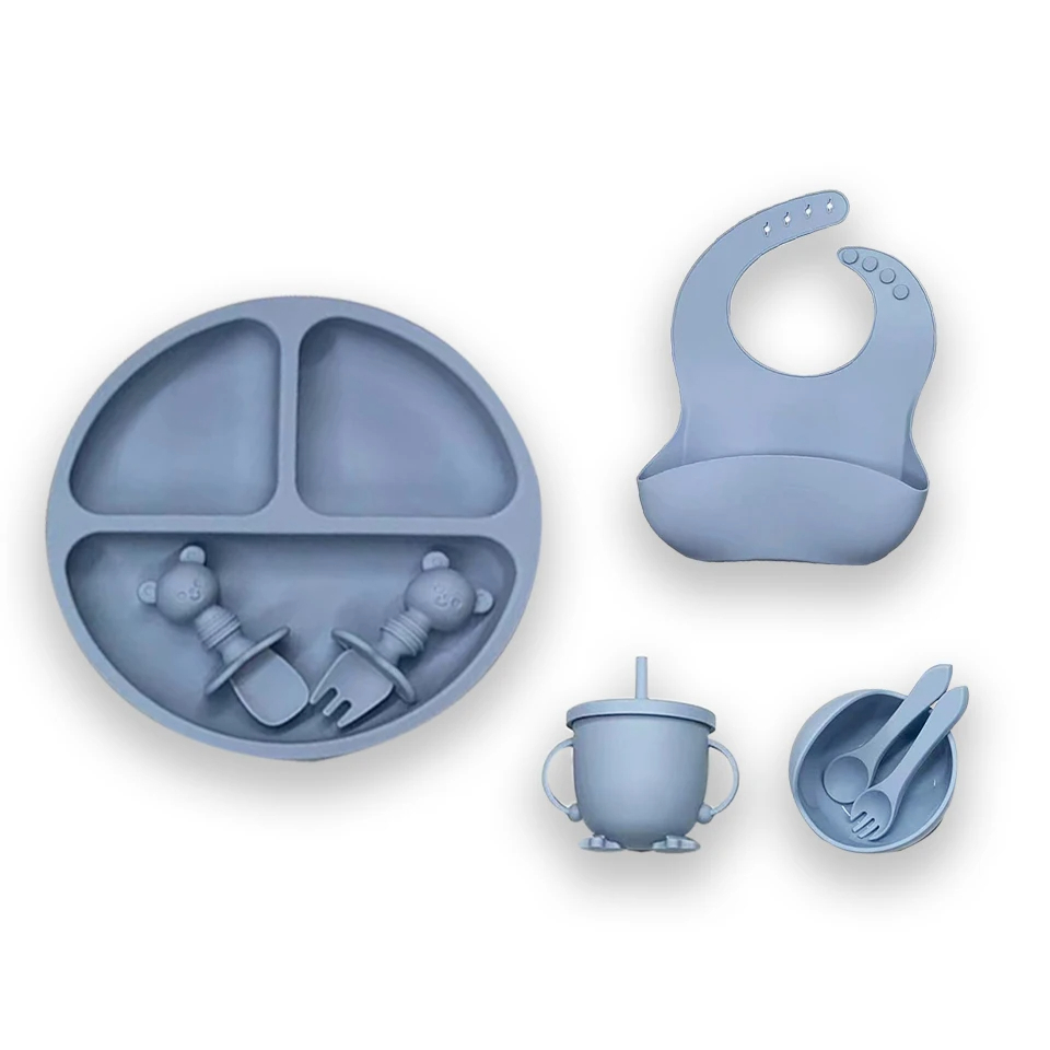 BPA Free Silicone Baby Feeding Set Sucker Bowl Divided Dinning Plate Straw Cup Spoon Fork Adjustable Bib Children’s Dishe Material Feature: BPA Free